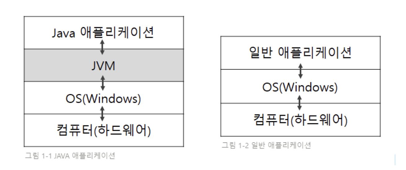 C 언어는 운영체제에 따라 다른 목적 파일(기계어)을 생성하지만, 자바는 목적 파일(바이트코드) 를 만들고 실제 물리적인 컴퓨터 내에 자바 언어가 운영체제에 따라 영향을 받지 않도록 JVM 을 이용하여 가상 컴퓨터 환경을 구축하고 그곳에 목적 파일을 던져 자바 코드를 실행시킨다.